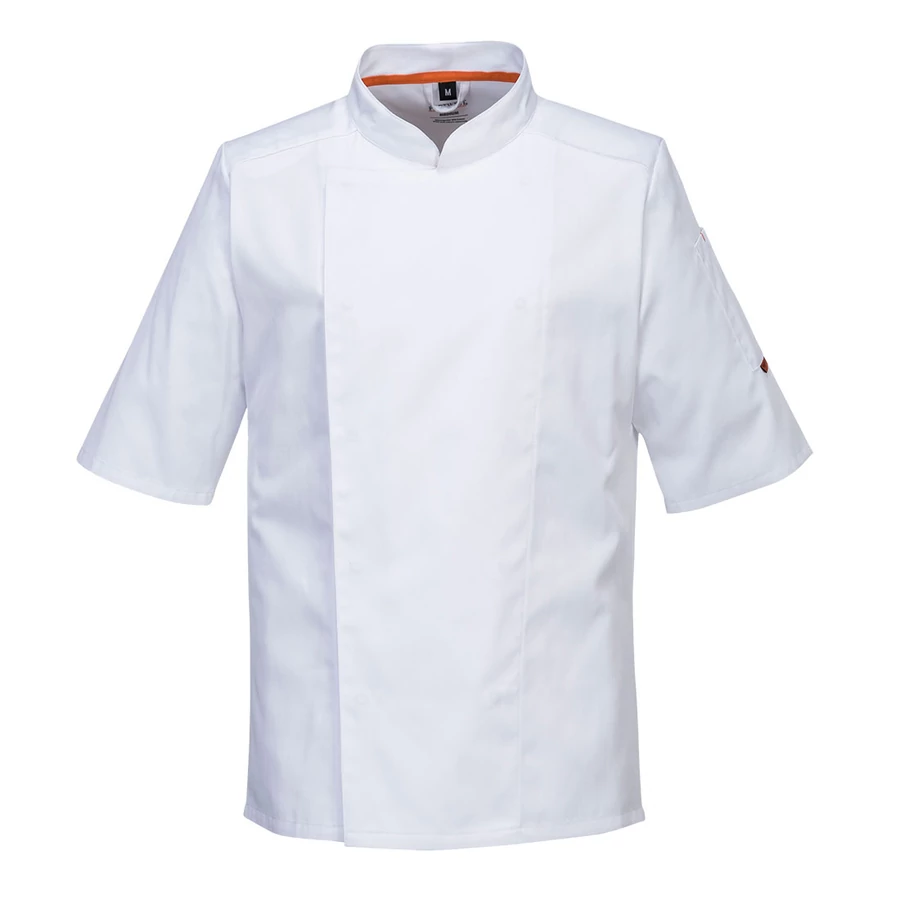 MeshAir panelekkel ellátott C738 ideális megoldás a forró konyhai környezetre. Dupla gombolású rejtett rögzítéssel és tollzsebbel. Stílusos és praktikus séfkabát.