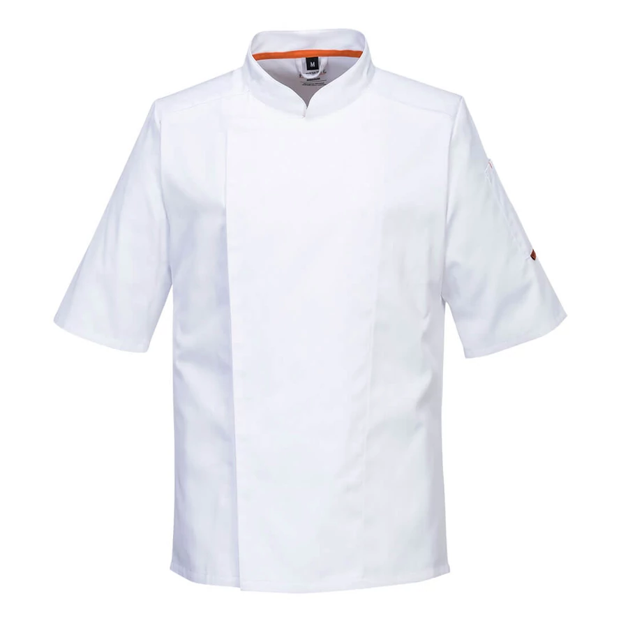 A MeshAir Pro hálós szellőzőpanelekkel ellátott stretch szövetből készült szakácskabát a C746 ideális megoldást kínál ha a konyhában meleg van. Dupla gombolású rejtett rögzítéssel és tollzsebbel. Stílusos és praktikus séfkabát.